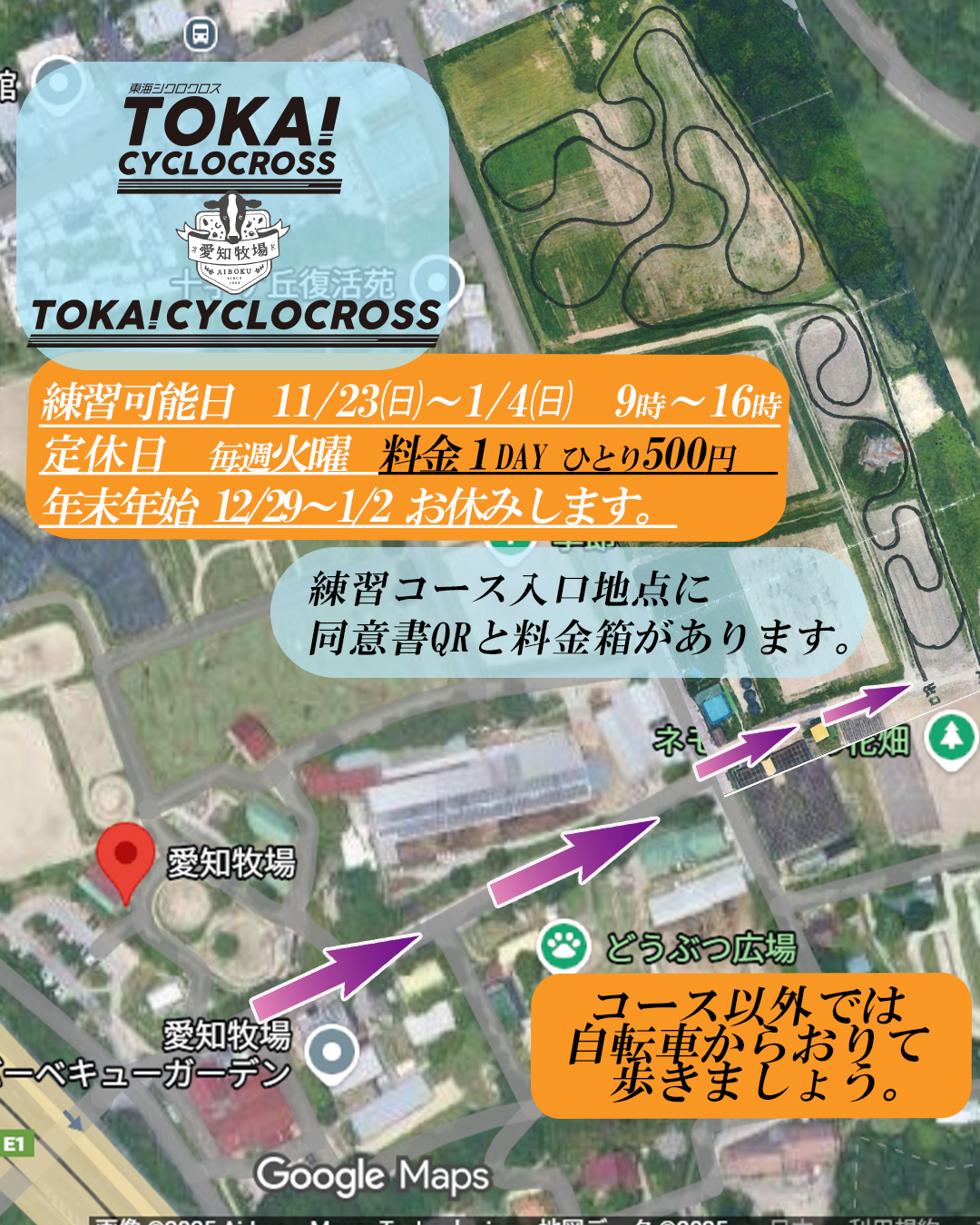 ・悪天候や雨などによりコースが荒れると判断した場合は走行禁止と致しますのでご注意願います。年末年始は12/29~1/2まで休業日です。
